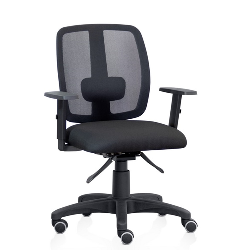 Cadeira com encosto em tela de qualidade superior e possui apoio lombar, proporcionando resistência e conforto. o assento é confeccionado em espuma de alta densidade com revestimento de longa durabilidade. com braços reguláveis em altura, oferecendo melhor adaptação ergonômica. sistema de ajuste inclui regulagem de altura do assento por pistão a gás e mecanismo de inclinação do encosto, permitindo diferentes posições de uso. base é giratória, em nylon com 5 rodízios, garantindo estabilidade e mobilidade.